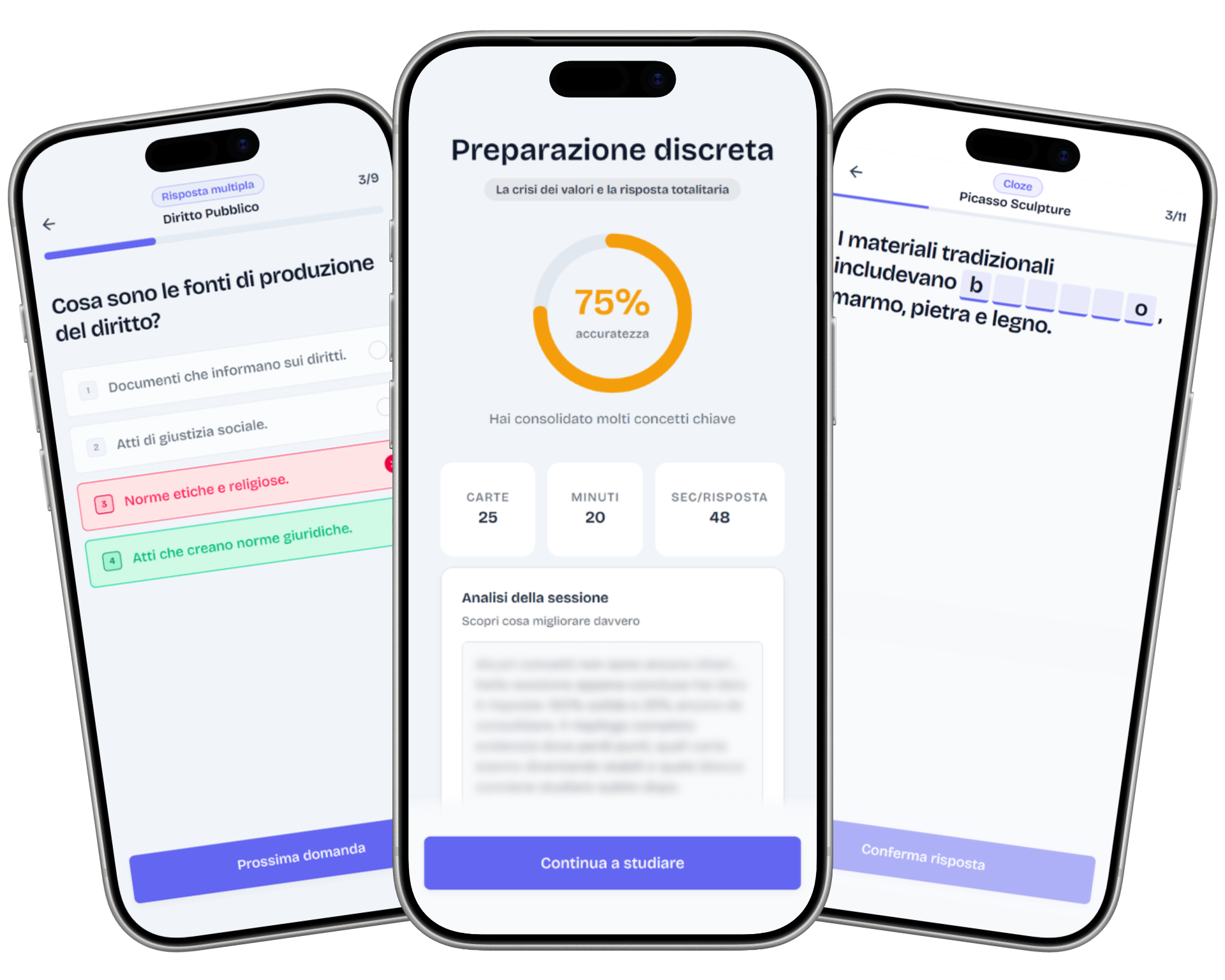 Durante lo studio non ti limiti a leggere: recuperi attivamente l’informazione dalla memoria. In base alle tue risposte, il sistema adatta automaticamente i tempi di ripasso, così rivedi le carte prima di dimenticarle e non perdi tempo su ciò che sai già.